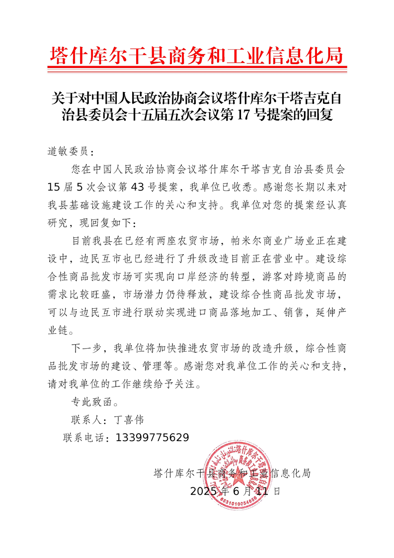 关于对中国人民政治协商会议塔什库尔干塔吉克自治县委员会十五届五次会议第17号提案的回复.pdf