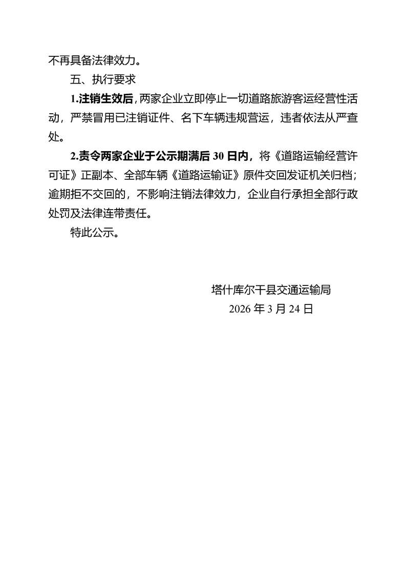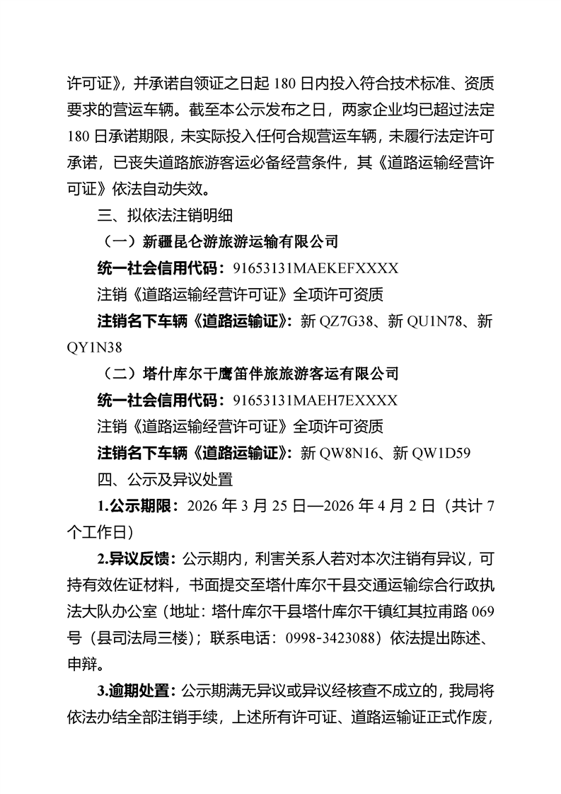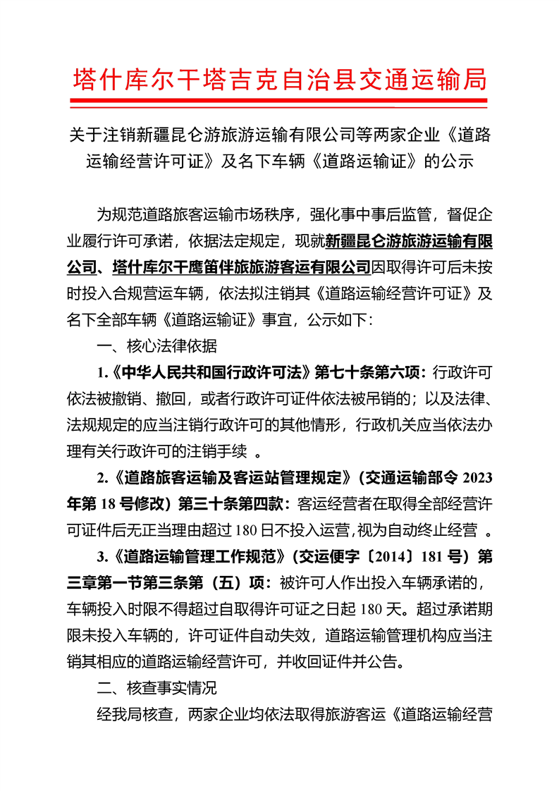 关于注销新疆昆仑游旅游运输有限公司等两家企业《道路运输经营许可证》及名下车辆《道路运输证》的公示