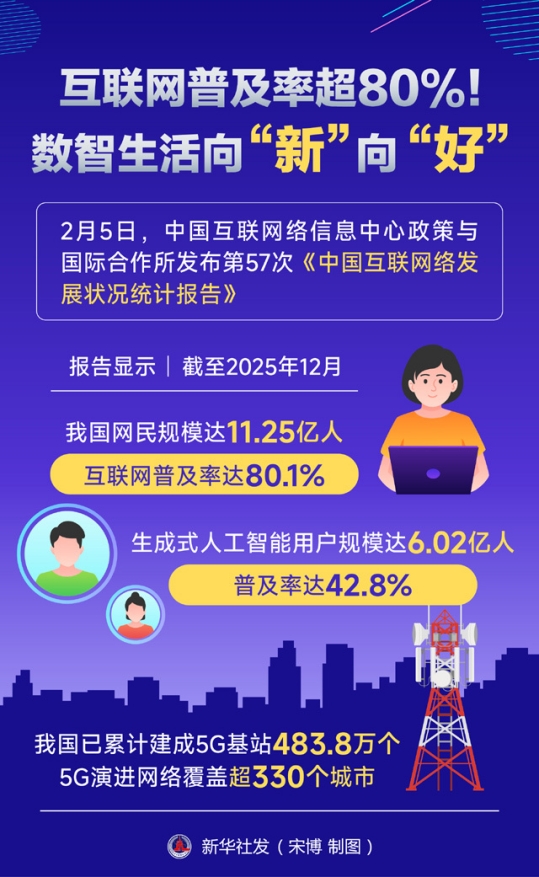 截至2025年12月,我国网民规模达11.25亿人,互联网普及率达80.1%;生成式人工智能用户规模达6.02亿人,普及率达42.8%。