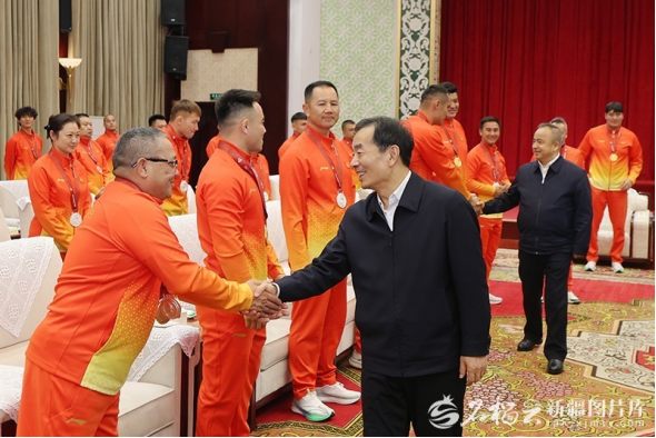 12月4日,自治区党委书记陈小江、自治区主席艾尔肯·吐尼亚孜同载誉归来的第十五届全国运动会新疆体育代表团获奖运动员、教练员代表亲切交谈,代表自治区党委和政府向他们表示热烈祝贺。石榴云/新疆日报记者 崔志坚摄