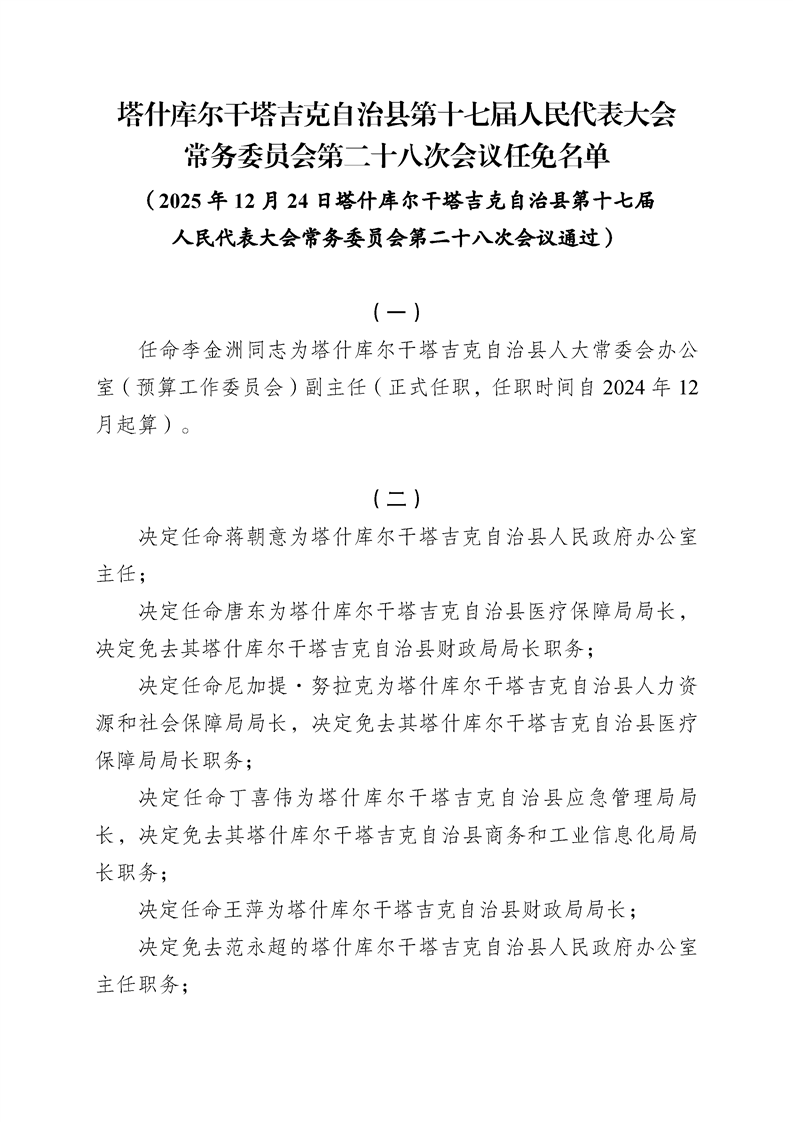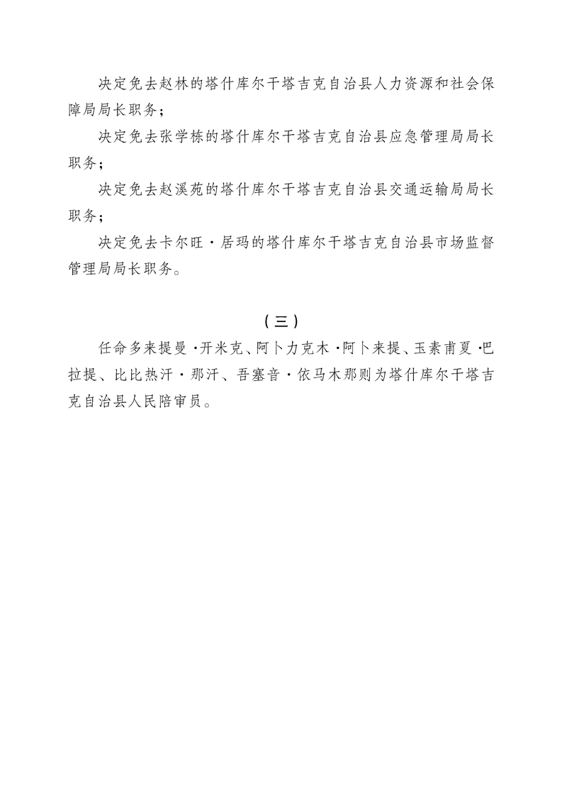 塔什库尔干塔吉克自治县第十七届人民代表大会常务委员会第二十八次会议任免名单