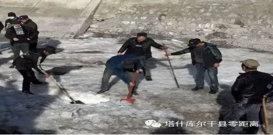 19日上午11时,暖暖的阳光洒在大地上,在新疆塔什库尔干塔吉克自治县的塔什库尔干乡的申关口水渠旁,聚集了来自各村的青壮年,一部分村民下到水渠里,用手中的工具将有些融化的冰面砸开,不一会一条水渠就挖完了,负责砸冰的年轻人还会将冰水用铁锨挑起来,洒在周围的人群中,大家不时地欢呼着,随着冰水缓缓的流入农田,也预示着这一年从这天崭新的开始。